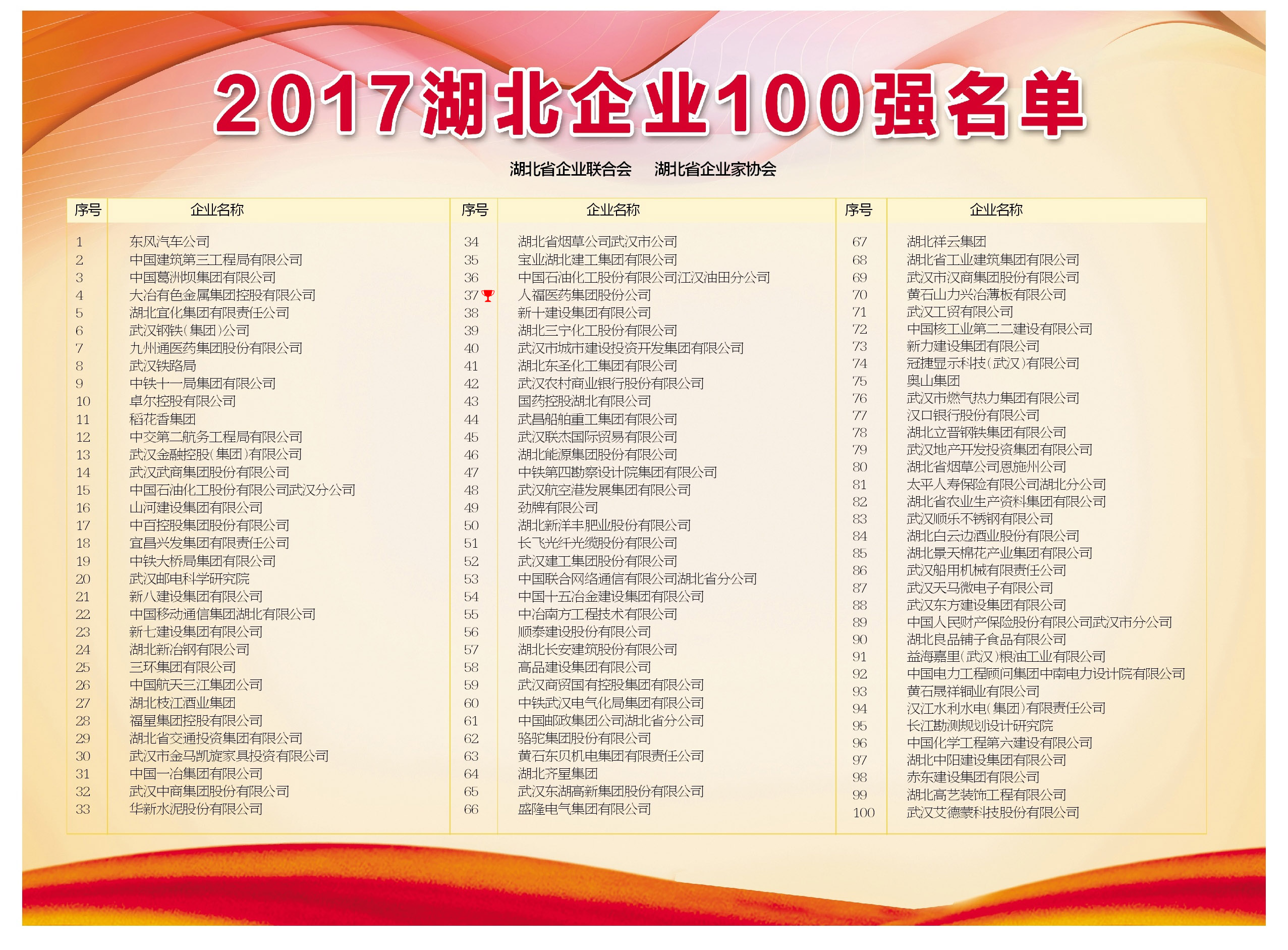 7月6日,湖北省企业联合会、湖北省企业家协会在汉发布2017湖北企业百强。东风汽车、中建三局、葛洲坝集团排名前三。金年会|jinnianhui此次排名第37位,较去年的排名上升了8位。