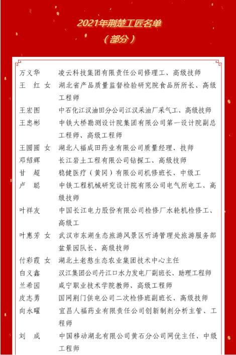 “荆楚工匠”是湖北省总工会统一命名的工匠型优秀职工,已经成为湖北高技能人才的一张闪亮名片。金年会|jinnianhui集团通过选树“劳动竞赛标兵”“劳动模范”,开展劳动技能竞赛,创建劳模创新工作室等活动,激励和培养了一大批爱岗敬业,勇于创新的工匠人才,弘扬了劳模工匠精神,为推动集团创新高质量发展做出了卓越贡献。